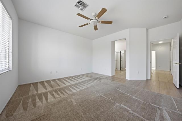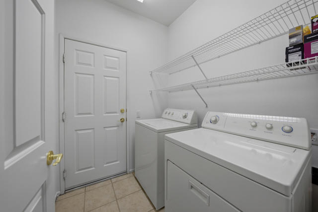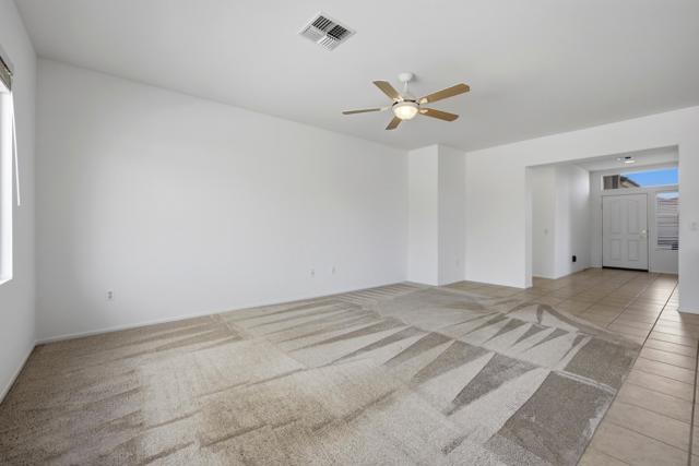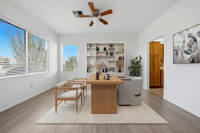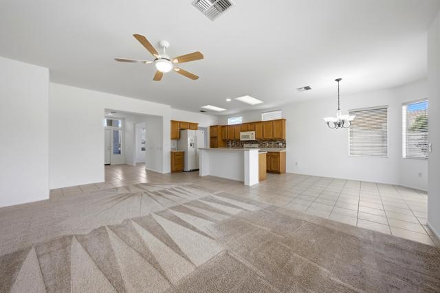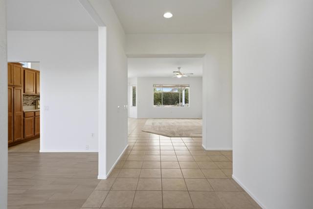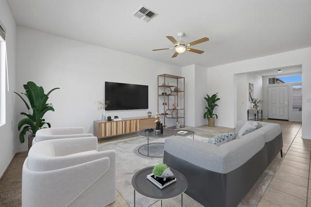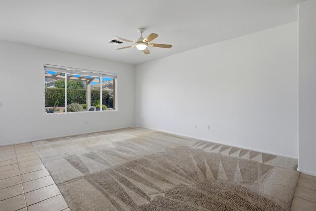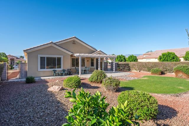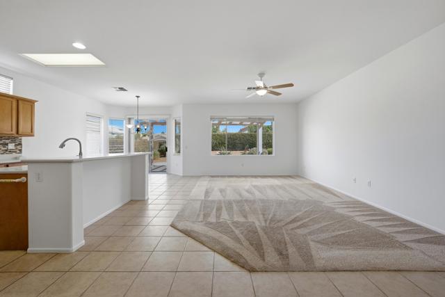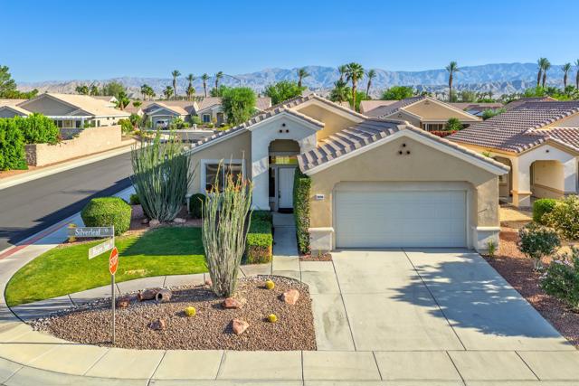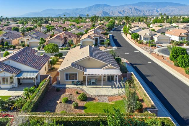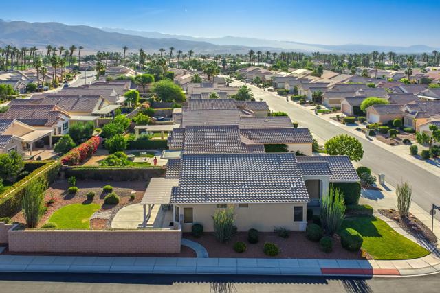 Sun City Palm Desert - Cayman. This popular greatroom floorplan offers 2 bedrooms, 2 bathrooms and a versatile den, ideally situated on a quiet cul-de-sac street that conveniently terminates at the Sunset View Clubhouse. Positioned on a desirable corner lot, the home enjoys a spacious, lushly landscaped north facing rear yard featuring an extended patio, alumawood patio cover, mature ocotillo and peek-a-boo mountain views. Inside, tile flooring is used extensively. The kitchen is thoughtfully designed with corian counters with rounded edges, a glass tile backsplash, and a chef's island with breakfast bar. The adjoining dining area features a bay slider that opens to the rear patio, enhancing indoor-outdoor living. The den/office is generously sized and finished with attractive wood-like tile flooring. The primary suite includes a walk-in closet with mirrored wardrobe doors and an en-suite bathroom with dual sinks and a stall shower with glass enclosure. The guest bedroom also features mirrored wardrobe doors, and the guest bathroom includes a tub/shower combination. The laundry room is conveniently located inside the home. Additional features include a spacious two-car garage with built-in storage and a Lennox AC system installed in 2019.