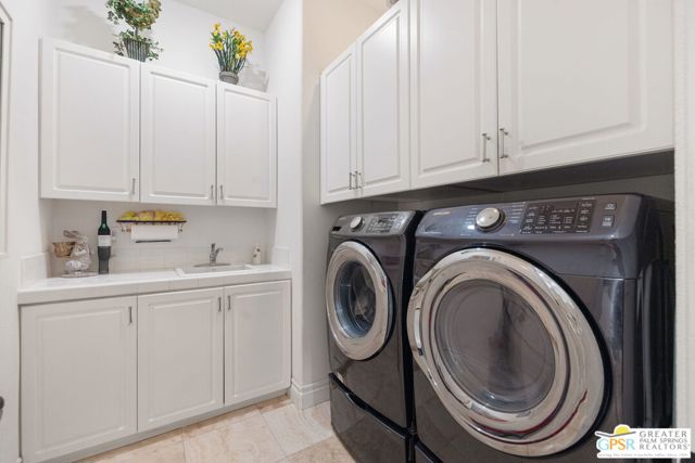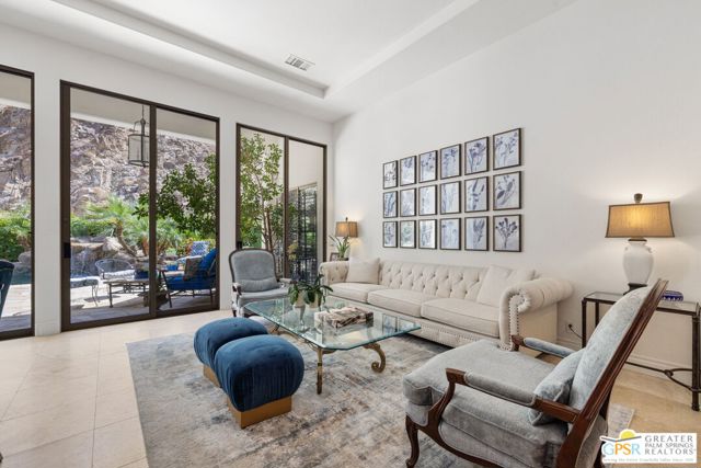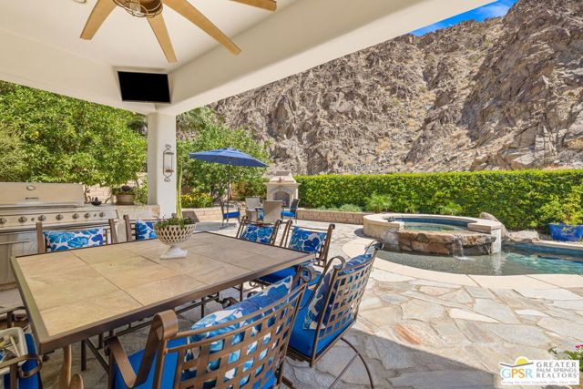 Welcome to the gated enclave of Hidden Canyon where you will find this extraordinary La Quinta residence. This home is the epitome of a private desert sanctuary, set against a breathtaking backdrop of dramatic rock hills, enveloped in serenity, with hummingbirds and butterflies enhancing the peaceful ambiance. The backyard is nothing short of spectacular, an entertainer's dream featuring a pebble-tec saltwater pool and spa with a cascading rock waterfall (recently refreshed) alongside a fire feature, flagstone hardscape, built-in BBQ, and multiple spaces for dining al fresco under a covered patio. Lush, mature landscaping surrounds you, including a rose garden, vibrant hibiscus, citrus trees (orange, lemon, and lime), and even a private putting green creating a true oasis. This home features four spacious en-suite bedrooms, plus an additional den or study that functions beautifully as a fifth bedroom. The primary suite is a true retreat, complete with dual walk-in closets, a spa-inspired bath with soaking tub, dual vanities, and backyard access. Inside you will find a thoughtful renovation with elevated finishes throughout. Travertine flooring flows seamlessly through expansive living spaces, including two distinct living areas, one anchored by a charming gas fireplace. The oversized gourmet kitchen is a showpiece, featuring quartz countertops, custom cabinetry, a designer backsplash, Sub-Zero refrigeration, stainless steel Viking appliances including a six-burner range, double ovens, a walk-in pantry, and dry bar, perfect for both everyday living and entertaining at scale. Additional highlights include plantation shutters throughout, abundant natural light, electric bamboo shades in the living room, automatic outdoor shades, a dedicated laundry room, and exceptional storage. Modern conveniences include two AC units, an 85-gallon water heater with recirculating pump, and updated systems. The three-car garage includes a separate golf cart garage with windows, plus additional refrigeration and wine fridge. The front yard has been upgraded with new pavers and low-maintenance turf, enhancing curb appeal while preserving ease of living. Ideally located just moments from La Quinta's Town Center with shopping and dining nearby. This dream home offers the perfect blend of privacy, luxury, and convenience.