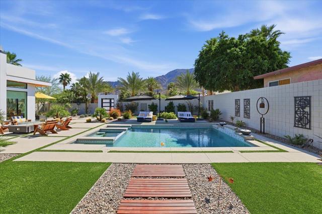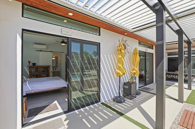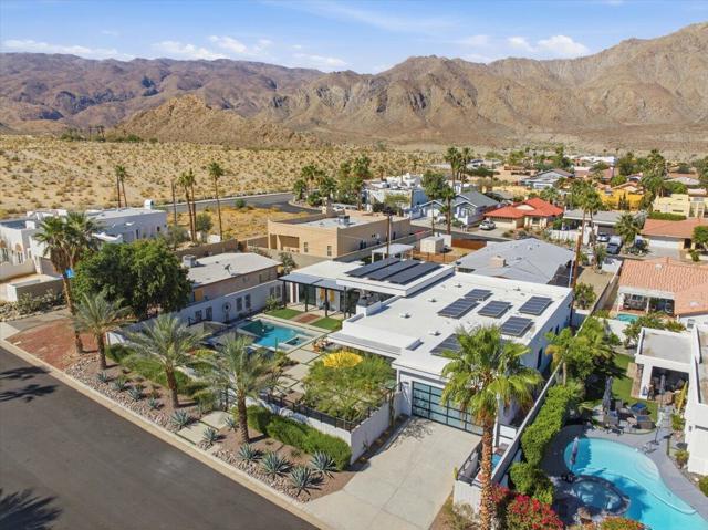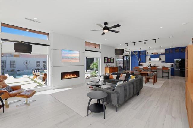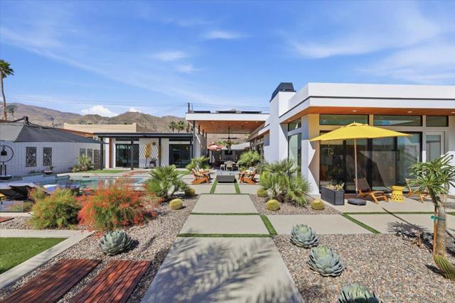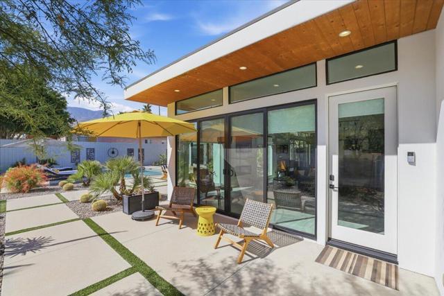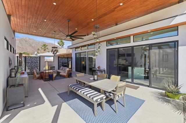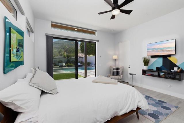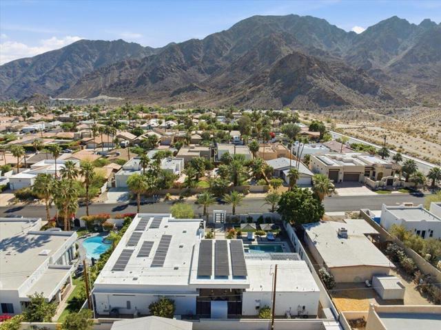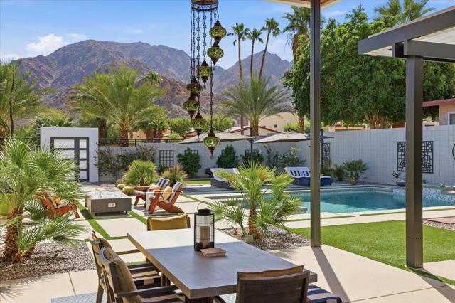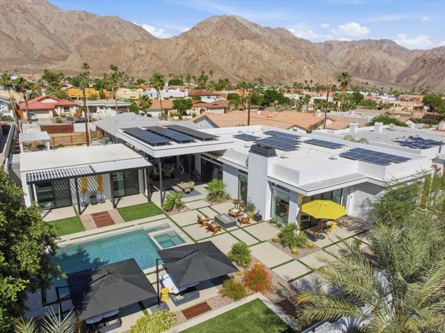 A Slice of Heaven, awaits you at the Top of La Quinta Cove! Step into this stunning contemporary modern desert home (2021), where style meets comfort and versatility. The main residence features two spacious en suite bedrooms, den, gorgeous kitchen, great room and powder room. It's complemented by a private 2 separate en suite casitas perfect for guests or extended family. Open floor plan with soaring high ceilings and abundant natural light, creating a bright and airy ambiance. The full chef's kitchen is a true centerpiece, showcasing sleek quartz countertops, a large center island, and modern finishes ideal for both everyday living and entertaining. Enjoy seamless indoor-outdoor living with a beautifully covered patio featuring a cozy fireplace perfect for relaxing or hosting gatherings year-round. The backyard offers a private resort-style experience with a sparkling pool and spa, all set against breathtaking desert mountain views. Complete with low-maintenance landscaping, this home allows you to fully enjoy the peaceful surroundings without the upkeep. Home includes PAID Solar and IID bill is close to nothing. A rare blend of modern design, functional space, and scenic beauty. A must see home!