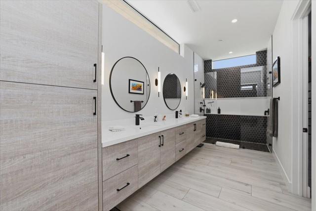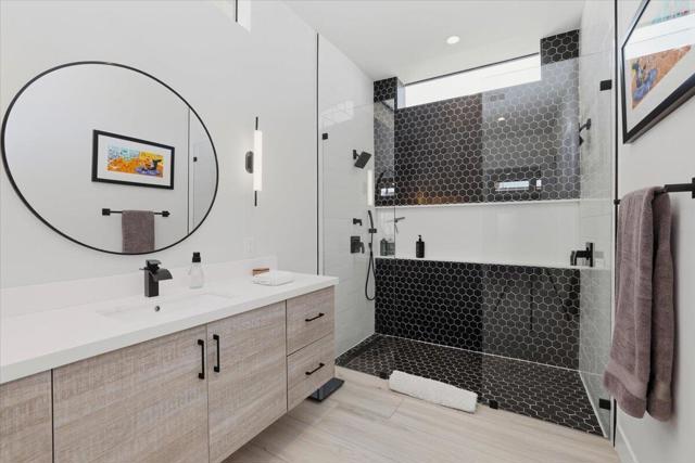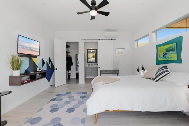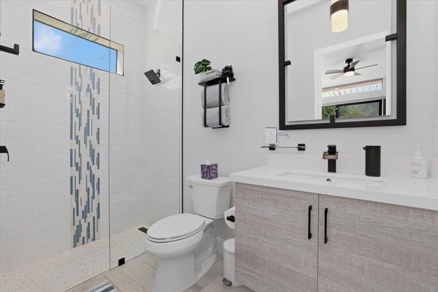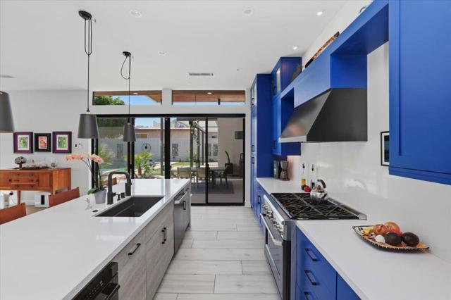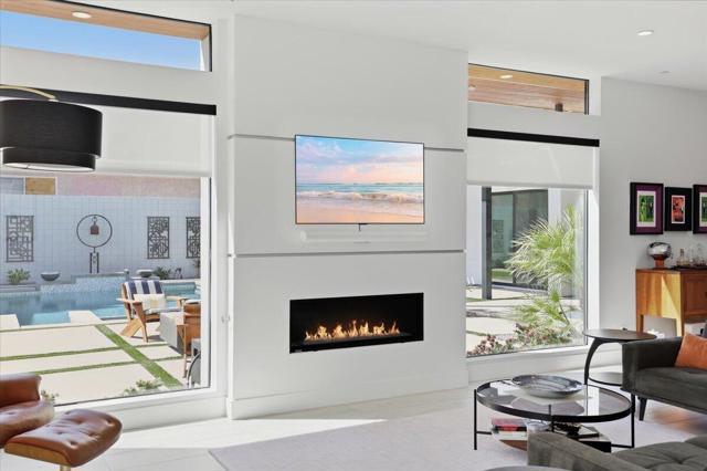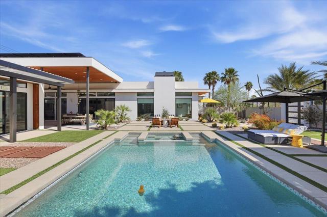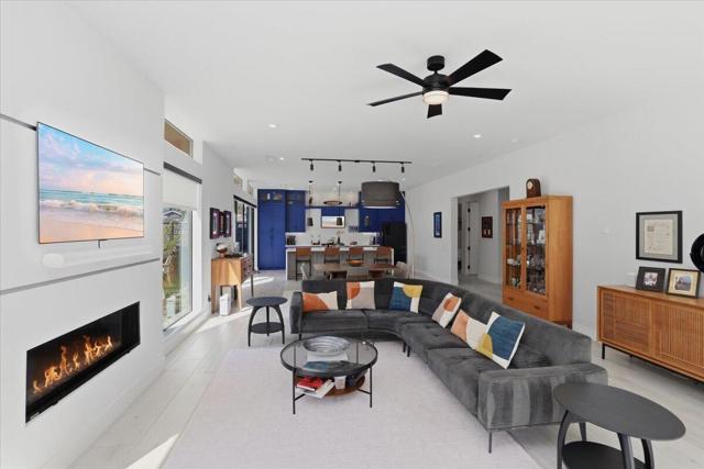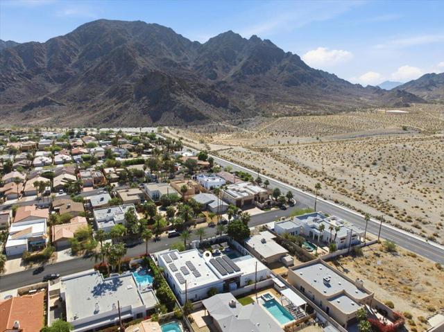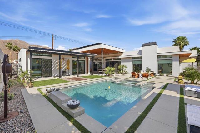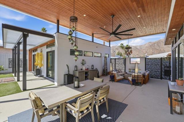 A Slice of Heaven, awaits you at the Top of La Quinta Cove! Step into this stunning contemporary modern desert home (2021), where style meets comfort and versatility. The main residence features two spacious en suite bedrooms, den, gorgeous kitchen, great room and powder room. It's complemented by a private 2 separate en suite casitas perfect for guests or extended family. Open floor plan with soaring high ceilings and abundant natural light, creating a bright and airy ambiance. The full chef's kitchen is a true centerpiece, showcasing sleek quartz countertops, a large center island, and modern finishes ideal for both everyday living and entertaining. Enjoy seamless indoor-outdoor living with a beautifully covered patio featuring a cozy fireplace perfect for relaxing or hosting gatherings year-round. The backyard offers a private resort-style experience with a sparkling pool and spa, all set against breathtaking desert mountain views. Complete with low-maintenance landscaping, this home allows you to fully enjoy the peaceful surroundings without the upkeep. Home includes PAID Solar and IID bill is close to nothing. A rare blend of modern design, functional space, and scenic beauty. A must see home!