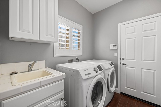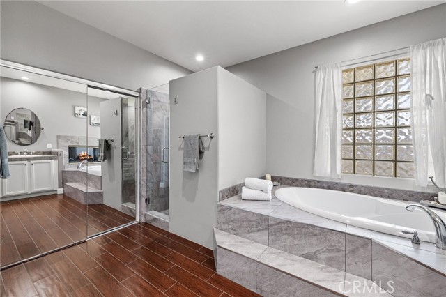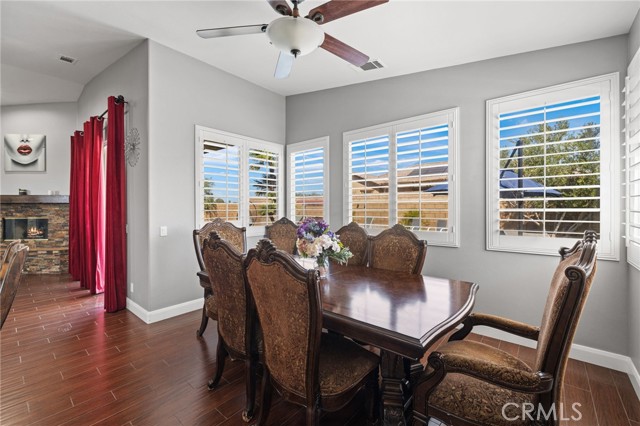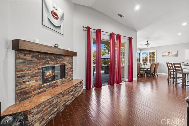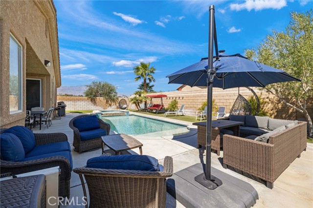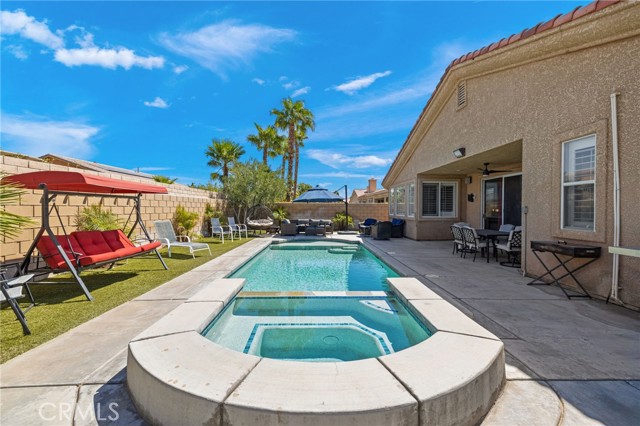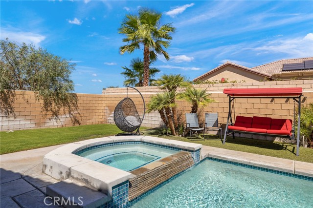 Welcome to this stunning 3 bedroom, 3 bathroom single-family home nestled in a quiet cul-de-sac, offering 2,265 sq ft of living space in the heart of Palm Desert. From the moment you arrive, the elegant double entry doors lead you into a spacious, light filled living area featuring vaulted high ceiling and a beautiful stone fireplace. The open concept kitchen and dining area are bright and inviting, with abundant cabinet space and room to gather. Large sliding glass doors seamlessly connect the indoor living space to a resort style backyard, complete with a covered patio, sparkling pool and spa, and lush landscaping perfect for entertaining or relaxing in your own private oasis. The master suite is a true retreat, showcasing a fireplace, soaking tub, double vanity, walk-in closet, and direct access to the pool and spa. The generously sized guest suite also includes a walk-in closet, while an additional bedroom is conveniently located near the third bathroom. Throughout the home, expansive windows, hardwood flooring and recessed lights. Each room filled with natural light, creating a warm and welcoming atmosphere. Recent upgrades include brand new AC units and the home also features solar panels for energy efficiency and cost savings. Additional highlights include a three car garage. Don’t miss the opportunity to make this exceptional property your own. schedule your visit today!