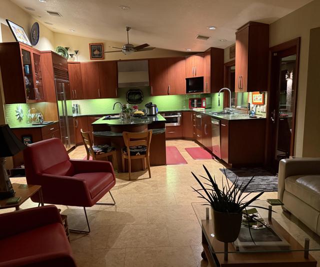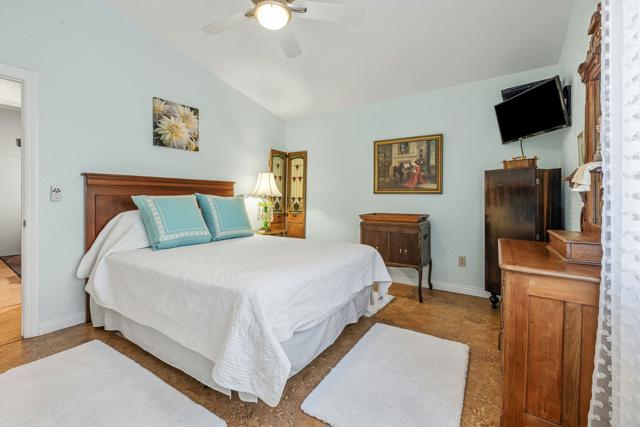 Welcome to your dream desert sanctuary in highly sought-after South Palm Desert, nestled on a quiet cul-de-sac just moments from the vibrant shops, art galleries, and restaurants of El Paseo. This home captures the essence of luxury desert living--where every day feels like a vacation.Step into an entertainer's paradise with an expansive outdoor living space designed for both lively gatherings and tranquil moments. Lounge by the sparkling pool with its elegant Hydrazzo marble finish, unwind under the newer full comp roof palapa-covered patio, and savor evenings by the warm glow of sthe outdoor stunning rock fireplace. The built-in BBQ and bar area set the stage for memorable nights under the desert stars, all framed by breathtaking mountain views.Inside, the open layout flows effortlessly from the living and dining rooms to the outdoors through beautiful wood sliding doors, blending comfort and sophistication. The Gourmet Chef's kitchen is a showpiece in itself, boasting a Wolf range, Miele convection oven, Sub-Zero refrigerator, dual dishwashers, wine/beverage fridge, prep sink island, and generous counter space--perfect for hosting family and friends or enjoying quiet mornings with coffee and sunshine.Every detail reflects thoughtful design and quality craftsmanship, warm wood-wrapped windows and doors, rich cork floors, granite counters, designer lighting, and ceiling fans that complement the airy, natural feel. Custom cabinetry throughout provides an abundance of storage while maintaining a sleek aesthetic.The primary suite is your private retreat, featuring direct access to the pool and patio, a spacious walk-in closet, and a spa-inspired bathroom that invites you to relax and recharge. Each guest suite offers its own private ensuite bath; one even includes direct outdoor access and a soaking spa tub for ultimate comfort.Additional highlights include a large three-car garage with easy access attic storage, plus a leased solar system providing energy efficiency and utility cost savings. Roof underlayment replaced appx. 2 years ago. Another added savings is NO Homeowners Assoc. Dues.This isn't just a home--it's a resort-style experience, where warmth, beauty, and sophistication come together to create the ultimate desert lifestyle. Welcome home to the heart of Palm Desert luxury. Buyer is advised to independently verify all information and conduct their own inspections and investigation.