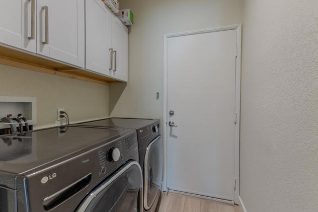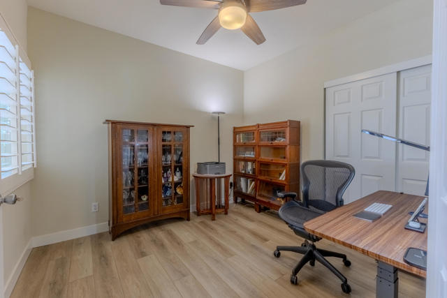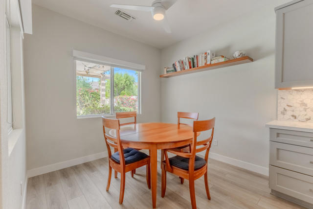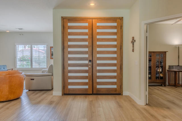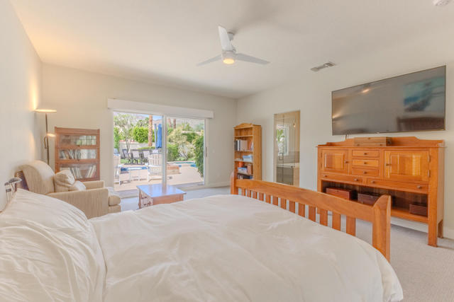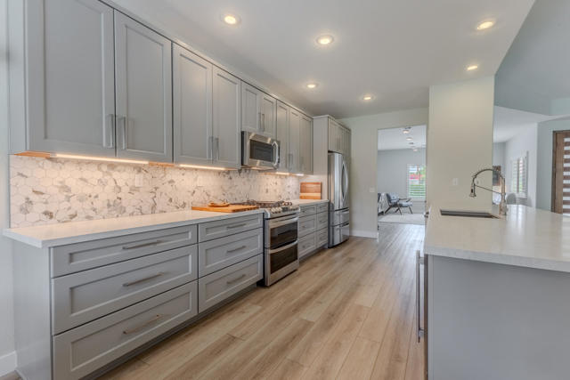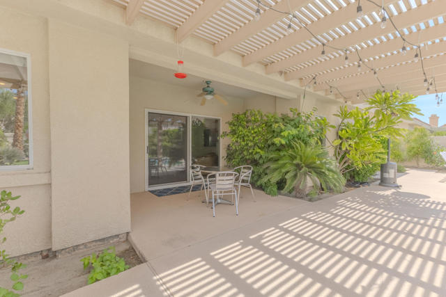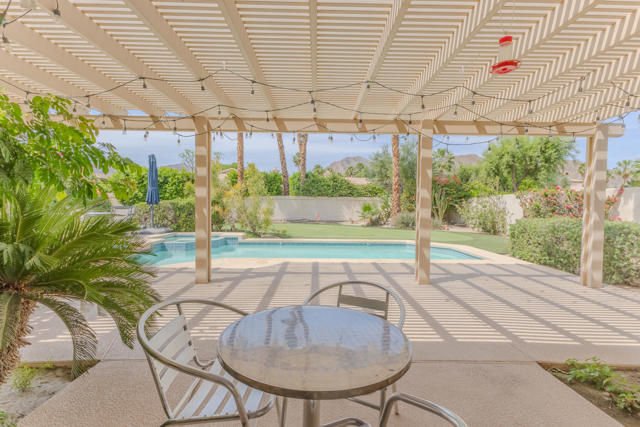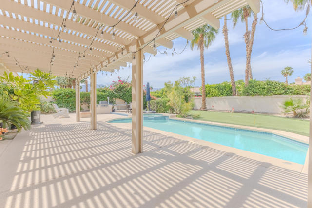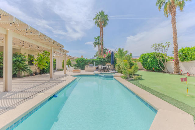 Nestled behind the gates of the prestigious Lake La Quinta community, this fully renovated 3 bedroom, 2 bath home, with 3 car garage, delivers the effortless desert lifestyle you have been searching for. Ideally situated just minutes from the world class dining, boutique shopping, and galleries of Old Town La Quinta, the tennis and pickleball facilities of the La Quinta Resort, and easy access to both the I-10 and Highway 111 corridor yet tucked away in a quiet, lushly landscaped enclave that feels a world apart.Inside, the open concept great room features a thoughtfully redesigned kitchen featuring quartz countertops, custom cabinetry, stainless steel appliances including a built-in wine fridge, and an eye catching custom tile backsplash anchored by a gas fireplace and designer acoustic slat wall paneling. New luxury vinyl flooring flows throughout the main living areas, lending a clean, contemporary feel. Both bathrooms have been fully renovated with custom tiled showers, updated cabinetry, and new countertops, delivering a fresh, polished look throughout.The generous primary suite is a true retreat featuring direct patio access through a slider door and beautiful mountain views. The backyard is an entertainer's dream, complete with a sparkling pool and spa, a fire pit, built in barbecue, and a large putting green, all set on a generous lot with stunning views of the Santa Rosa Mountains. The Alumawood covered back patio creates a seamless indoor outdoor living experience, ideal for al fresco dining or quiet evenings under the stars. A gated front courtyard adds curb appeal and a welcoming sense of arrival.Additional upgrades include a fully replaced AC system, brand new high insulation patio doors, and an EV charger in the garage, making this home as practical as it is beautiful.Lake La Quinta is a 24 hour guard gated community centered around a stunning 25 acre private lake where residents enjoy electric boating, kayaking, canoeing, and fishing. Community amenities include a pool, tennis and pickleball courts, bocce ball, a BBQ area, and a large park with walking paths, all with roving security patrols for added peace of mind. HOA dues even cover front yard landscaping and internet/cable, making this truly a lock and leave lifestyle. With everything the desert has to offer just moments away, this is Coachella Valley living at its finest.
