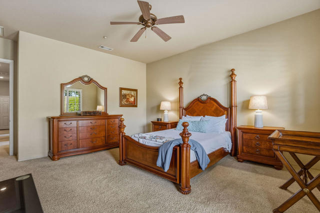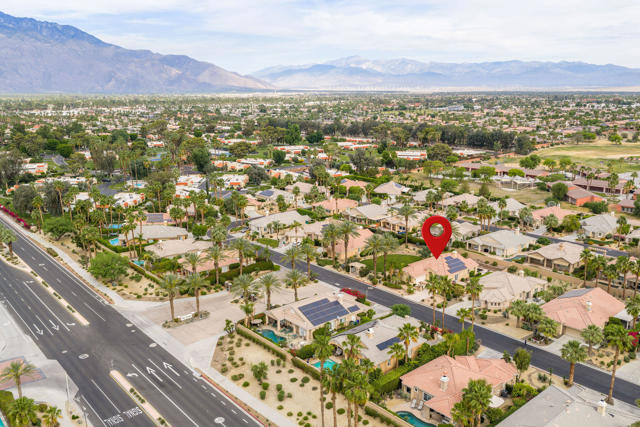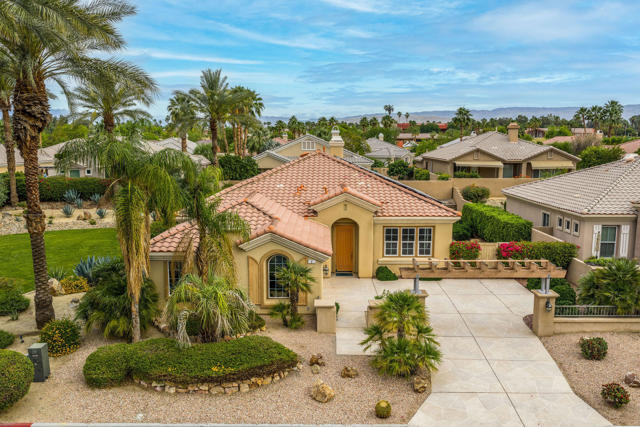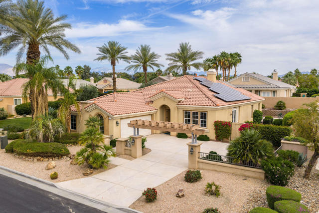 Special gated enclave of 64 Tuscan-inspired homes surrounded by mature landscaping and views. Built in 2003, this Rancho Mirage home sits within this gem of a community. 3 bedrooms and 2 baths plus a family room with a fireplace. 2 car attached garage; stamped concrete driveway. French doors from the dining room to a small patio. Also, French doors leading from the primary bedroom to the pool and patio. Enjoy the partial mountain view from the pool area. Separate laundry room. Quality Louvered shutters. Home is being sold turnkey. Solar lease easy to transfer for next 7 years, current monthly fee is approximately $205. Come and relax in the privacy of this quaint, peaceful, upscale community.