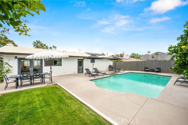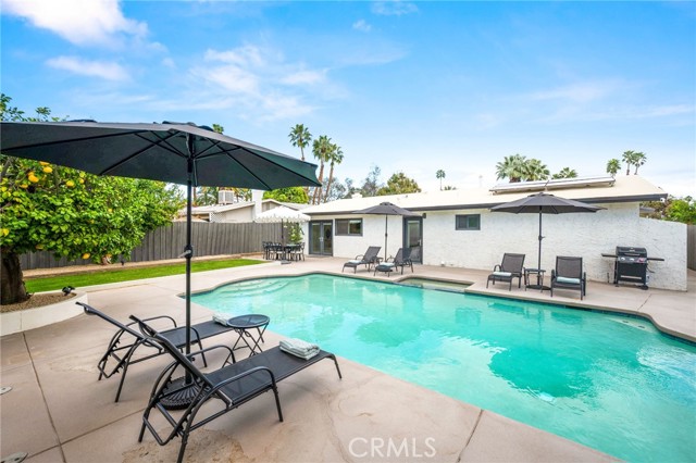 This thoughtfully curated 2-bedroom, 2-bath residence is ideally situated within one of Palm Desert’s most desirable central neighborhoods, offering a sophisticated blend of mid-century character and contemporary design. Recently reimagined, the open-concept floor plan showcases elevated finishes throughout, including quartz surfaces, clean architectural lines, and carefully integrated designer details. A statement 1960s hand-carved entry door—sourced from another iconic Palm Desert mid-century home—introduces the property’s distinctive architectural heritage. Inside, light-filled living spaces flow effortlessly, creating an atmosphere that feels both refined and relaxed. The primary suite serves as a private retreat, complete with an oversized walk-in closet and a spa-inspired bath designed with understated luxury in mind. The home is offered beautifully furnished with curated pieces from Restoration Hardware, delivering a cohesive, turnkey aesthetic. Outdoors, the experience becomes truly resort-like. A sparkling pool and spa anchor the backyard, framed by newly completed hardscape and landscape enhancements (2025). The pool system is fully app-controlled, allowing effortless management of temperature, lighting, and spa settings from anywhere. With no rear neighbor and direct bordering to the prestigious Toscana Country Club, the setting offers rare privacy and unobstructed mountain views. Enhancing both sustainability and long-term value, the home is equipped with a full solar panel system, delivering energy efficiency and meaningful utility savings. The roof was recoated in 2025, further providing peace of mind. Additional features include a two-car garage with a separate storage room. Located just minutes from El Paseo, the Indian Wells Tennis Garden, La Quinta, and world-class golf, this turnkey residence presents a rare opportunity as a primary home, luxury desert retreat, or fully furnished investment property.
