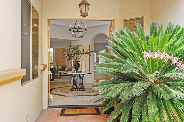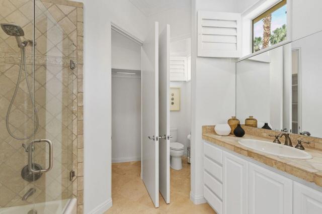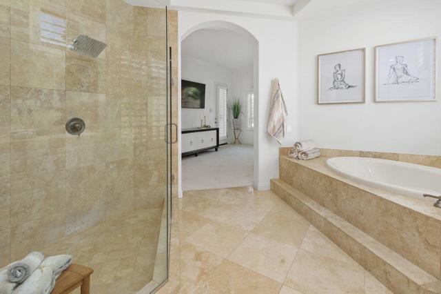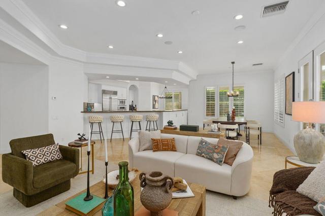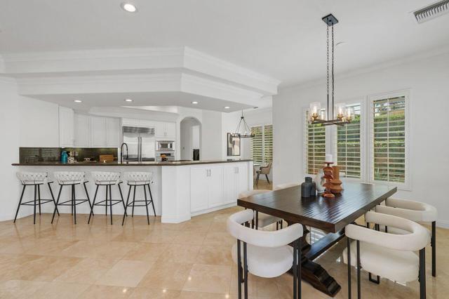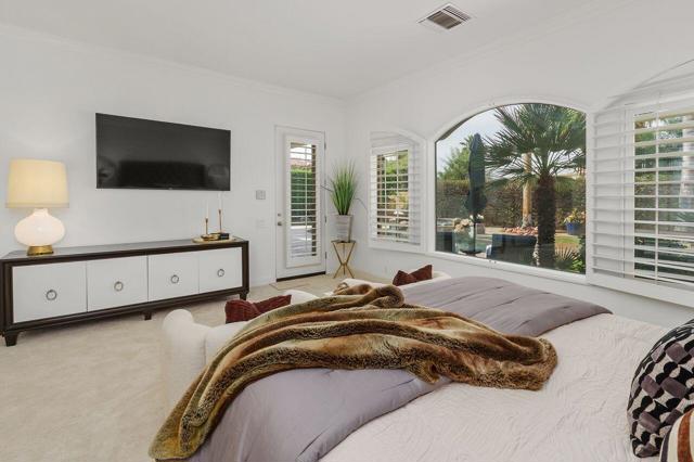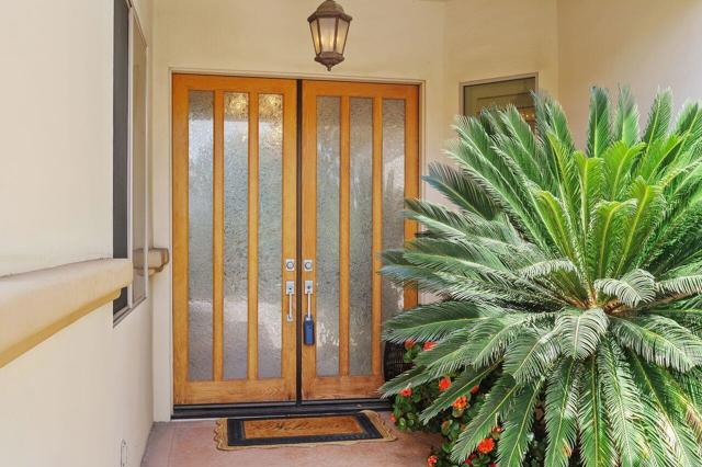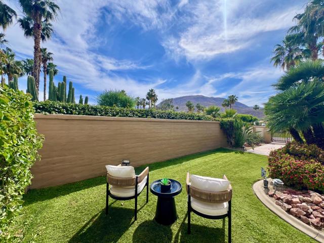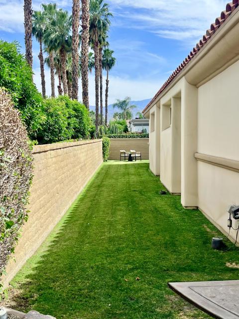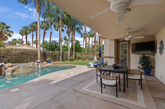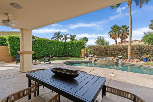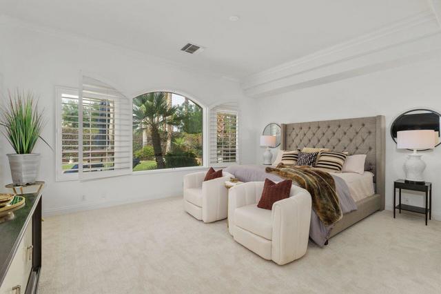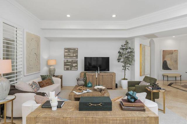 This 10+ stunning home has it all! One of the most desirable gated communities in Rancho Mirage with the most incredible Mountain and Star gazing views with plenty of privacy. Between El Paseo ''Rodeo Drive of the Desert'' & The River with shopping & restaurants galore! Also, nearby tennis & Pickleball courts, bike & walking trails, and the Omni- Rancho Las Palmas Golf & Resort. Through the private courtyard gates, you will find your own paradise! Double glass entry doors, top quality smooth stucco finish, solid 2x6 Construction, soaring 10' to 12' ceilings w/crown molding, 8ft solid core doors, exquisite custom light fixtures & fans, wide open floor plan w/walls of glass everywhere you look! Chef's dream kitchen with professional stainless built-in refrigerator & appliances, center island cook top, huge sit-down Island bar and breakfast nook with French door access to the backyard pool area. Elegant dining rm is a part of the greatroom design perfect for entertaining! 3 bedrooms plus an enclosed office. Generous primary suite with a spa-like bath with a tub & a separate shower, & large walk-in closet. 2 Generous guest bedrooms and baths. And a small office off the 2nd guest bedroom or 2nd entry from Garage. Laundry rm w/sink & storage. Expansive patio has outdoor entertaining w/tv, dining & firepit conversation area with Stunning Mountain Views! Large grassy areas in backyard, side yard and front courtyard. Waterfall saltwater Pool & Spa. Staged Furnishings available on separate contract. Low HOA of $195.00