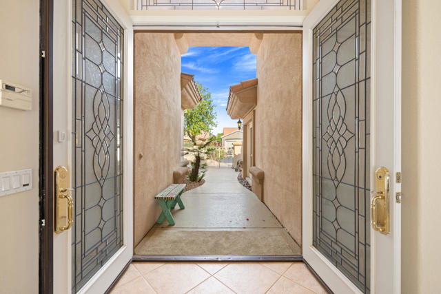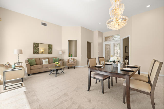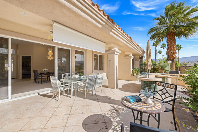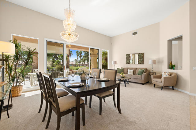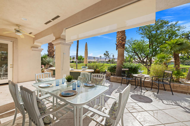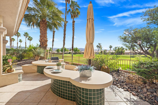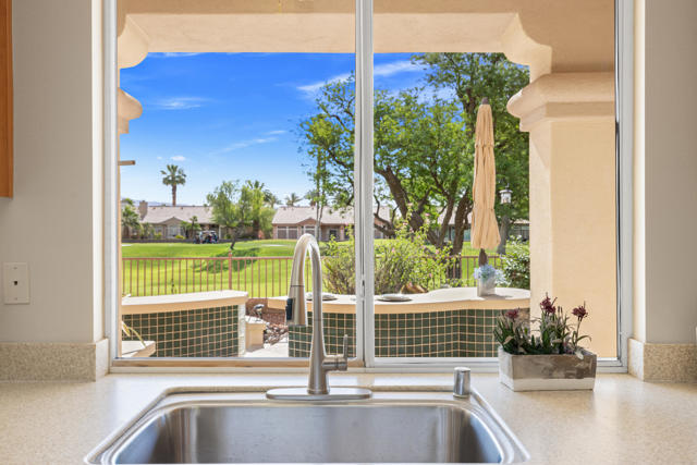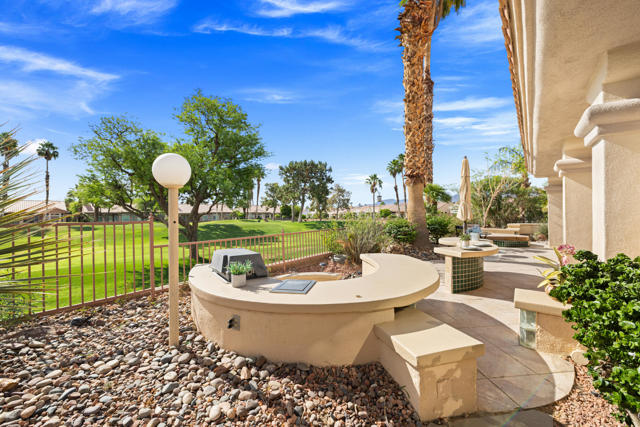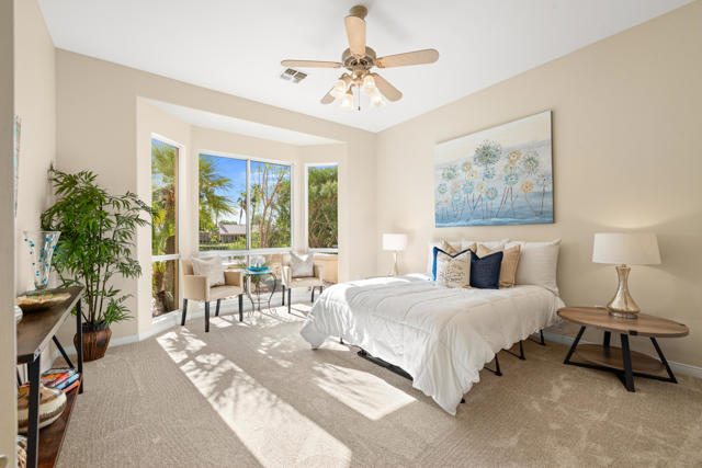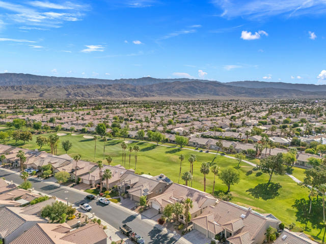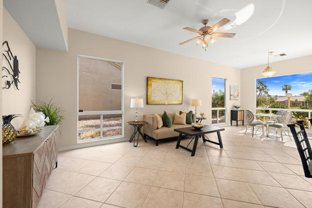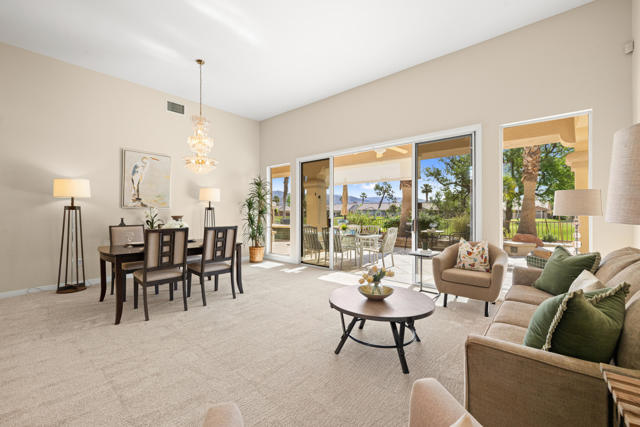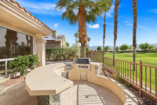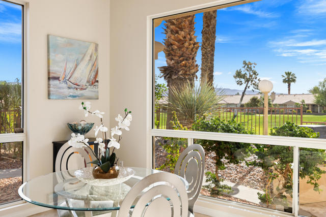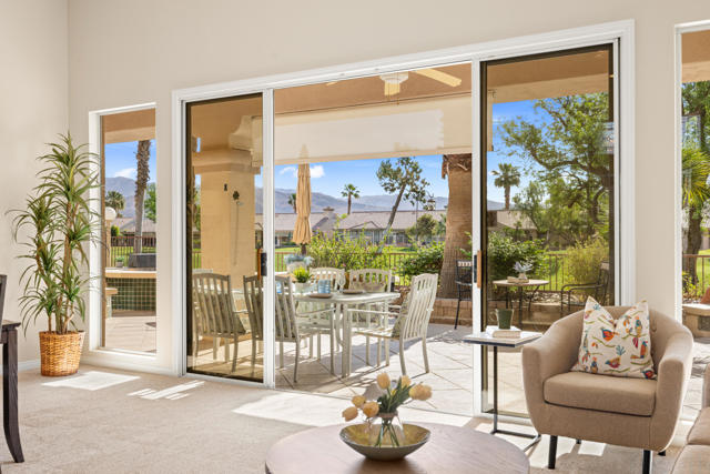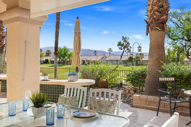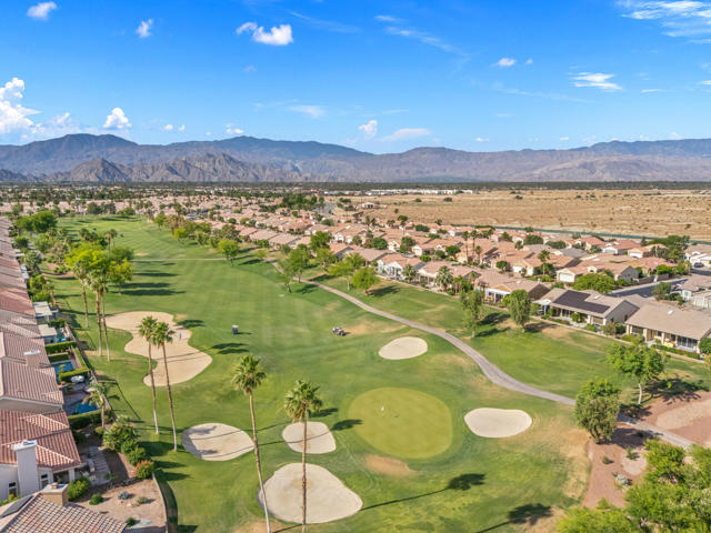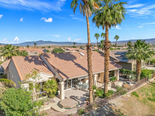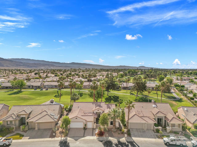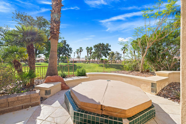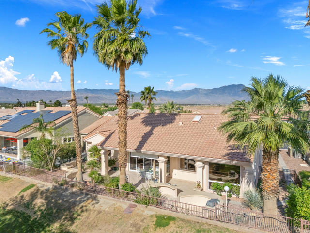 55+ Sun City Palm Desert--Fully Extended Monaco model with 3 bedrooms plus an office area, 3 full baths with all new carpet and new paint. Fantastic location on the 13th tee of the Santa Rosa Golf Course with expansive golf course and mountain views, a cool east facing covered patio perfect for your morning coffee and afternoon entertaining. Beautiful curb appeal with painted concrete, private gated courtyard leading to the impressive double doors with glass panels. Inside, an inviting dining area and living room boasts high ceilings and a wall of windows and sliding doors filling the room with natural light. A gourmet kitchen opens up to a casual family room and kitchen nook with a view. The kitchen features a 10 foot-long chef's island, vegetable sink, Corian counters, and black appliances. The master suite features a bay window, large master bath with dual vanities, separate tub and shower and spacious walk-in closet. The two extended guest suites are considered 'attached' casitas as they both have French doors that open to the courtyard and both have en-suite full bathrooms. The laundry doubles as an office space and the washer, dryer and sink are in the garage. The 2-car plus golf cart garage is extended. The patio has built-in BBQ and hot tub (both will be included 'As Is') This home is being sold by the executor of the estate and will be sold 'As Is'.Sun City has so much to offer...3 clubhouses, two 18-hole golf courses, 4 salt water pools (one indoor), tennis, pickleball, softball, bocce ball, 18-hole putting course, 2 restaurants and 70 social and art clubs all convenienly located near gorcery shopping, dining, and medical services. 'Buy Where You Love to Play....Sun City Palm Desert!'