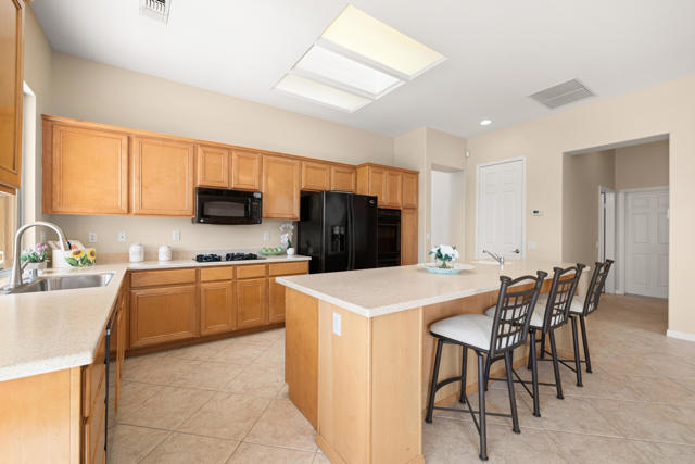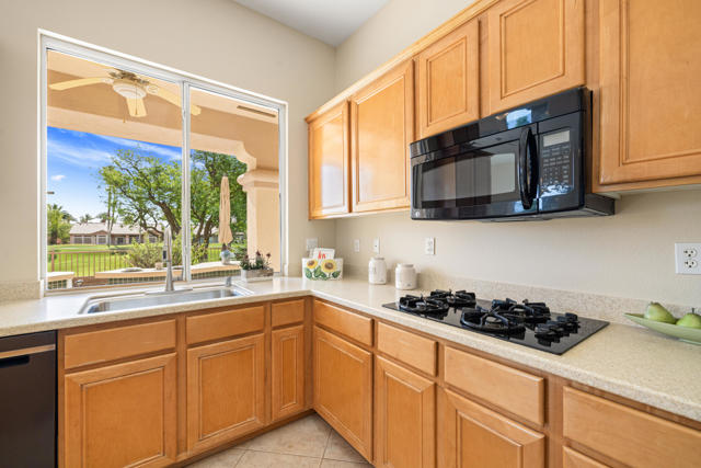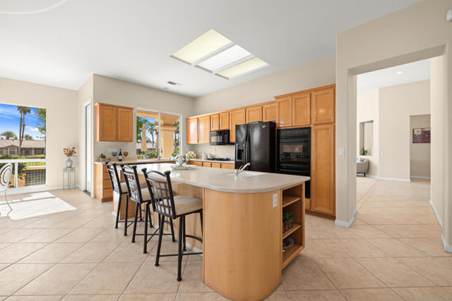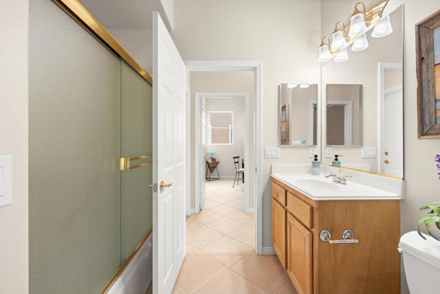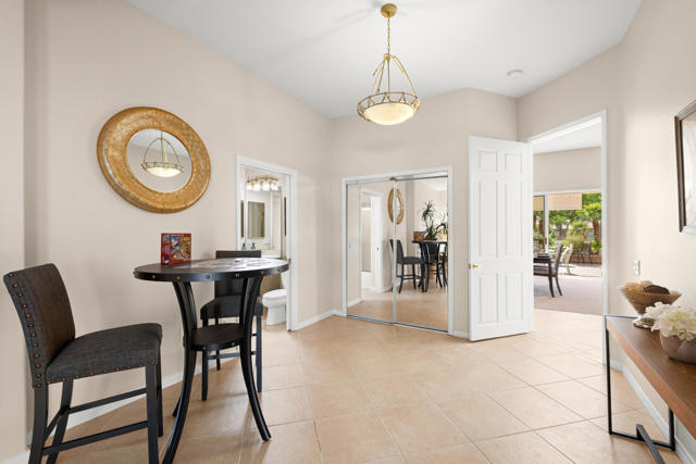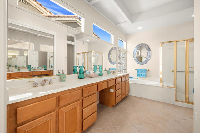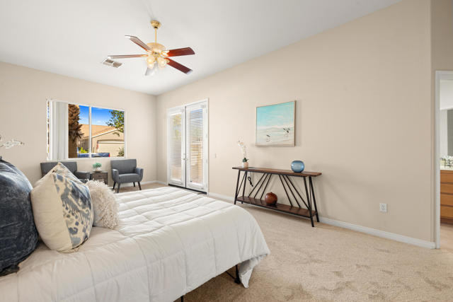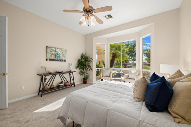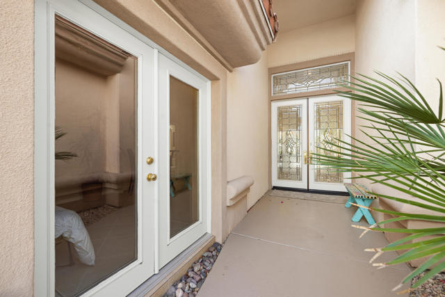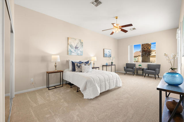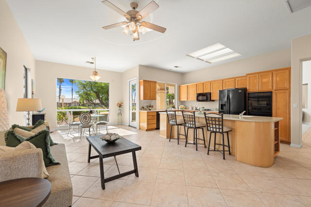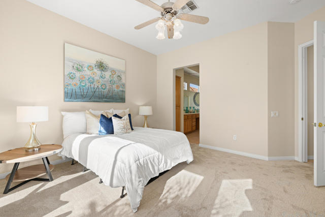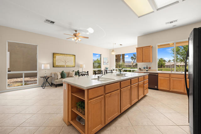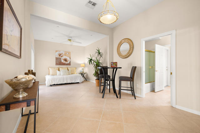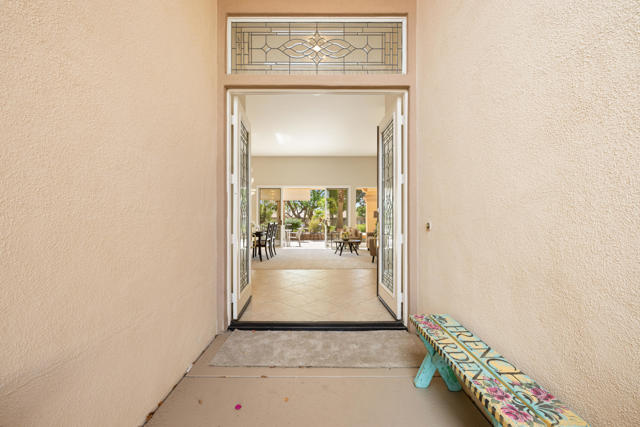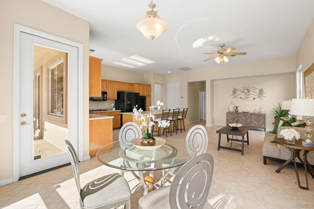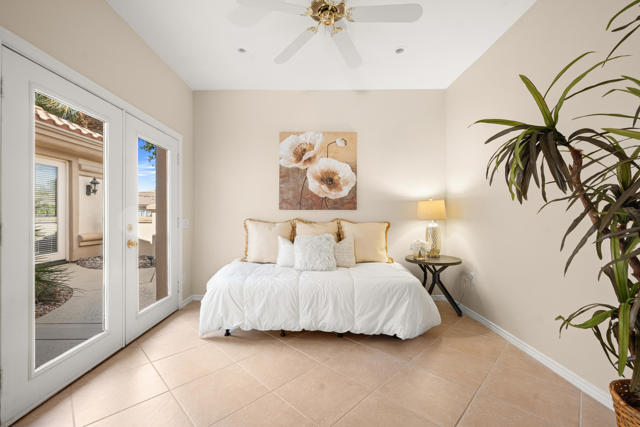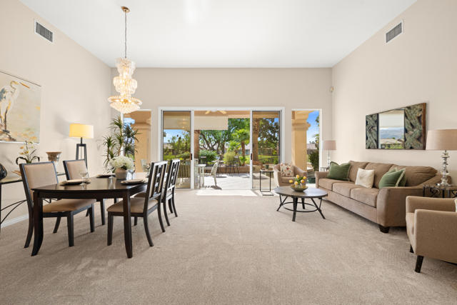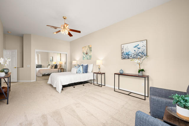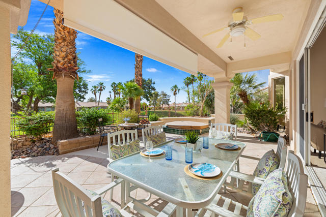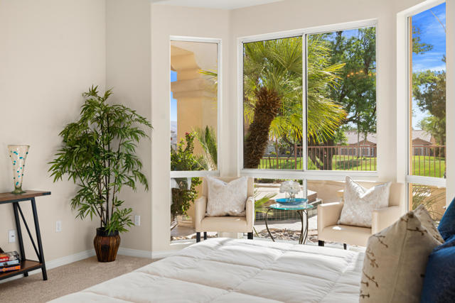 55+ Sun City Palm Desert--Fully Extended Monaco model with 3 bedrooms plus an office area, 3 full baths with all new carpet and new paint. Fantastic location on the 13th tee of the Santa Rosa Golf Course with expansive golf course and mountain views, a cool east facing covered patio perfect for your morning coffee and afternoon entertaining. Beautiful curb appeal with painted concrete, private gated courtyard leading to the impressive double doors with glass panels. Inside, an inviting dining area and living room boasts high ceilings and a wall of windows and sliding doors filling the room with natural light. A gourmet kitchen opens up to a casual family room and kitchen nook with a view. The kitchen features a 10 foot-long chef's island, vegetable sink, Corian counters, and black appliances. The master suite features a bay window, large master bath with dual vanities, separate tub and shower and spacious walk-in closet. The two extended guest suites are considered 'attached' casitas as they both have French doors that open to the courtyard and both have en-suite full bathrooms. The laundry doubles as an office space and the washer, dryer and sink are in the garage. The 2-car plus golf cart garage is extended. The patio has built-in BBQ and hot tub (both will be included 'As Is') This home is being sold by the executor of the estate and will be sold 'As Is'.Sun City has so much to offer...3 clubhouses, two 18-hole golf courses, 4 salt water pools (one indoor), tennis, pickleball, softball, bocce ball, 18-hole putting course, 2 restaurants and 70 social and art clubs all convenienly located near gorcery shopping, dining, and medical services. 'Buy Where You Love to Play....Sun City Palm Desert!'
