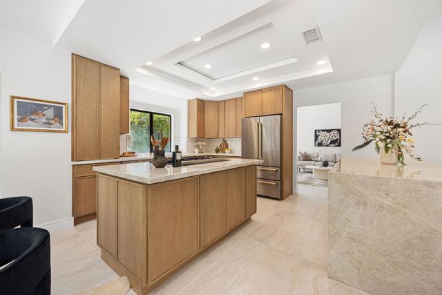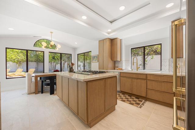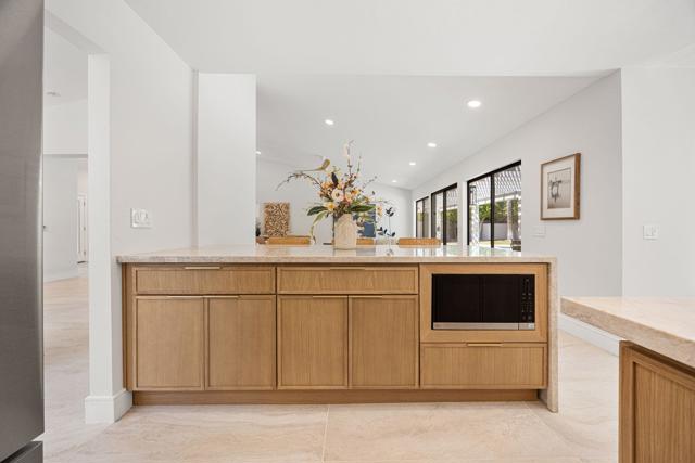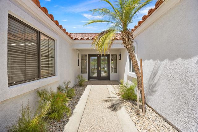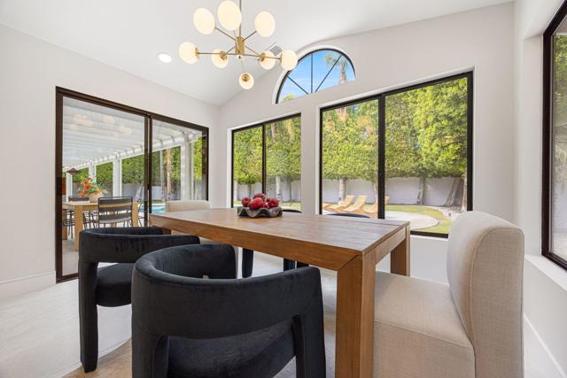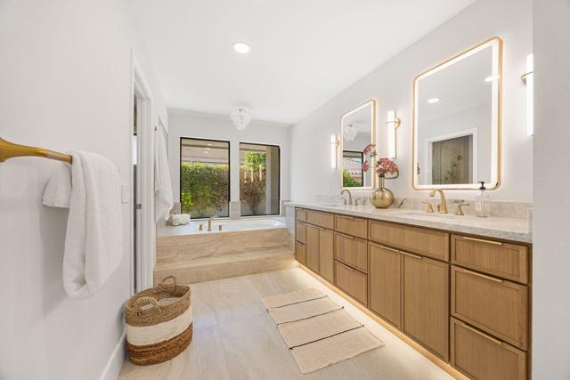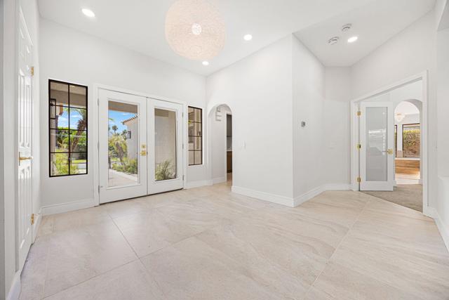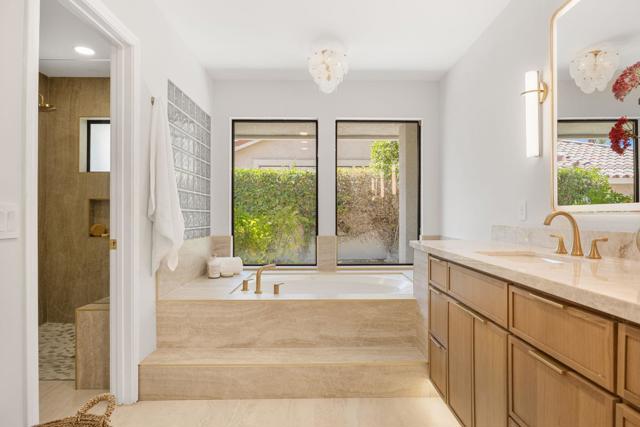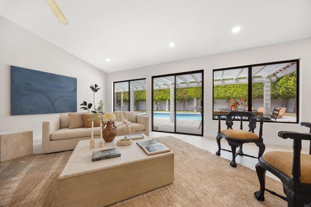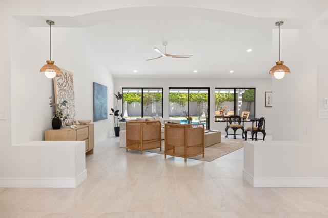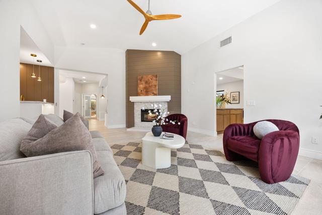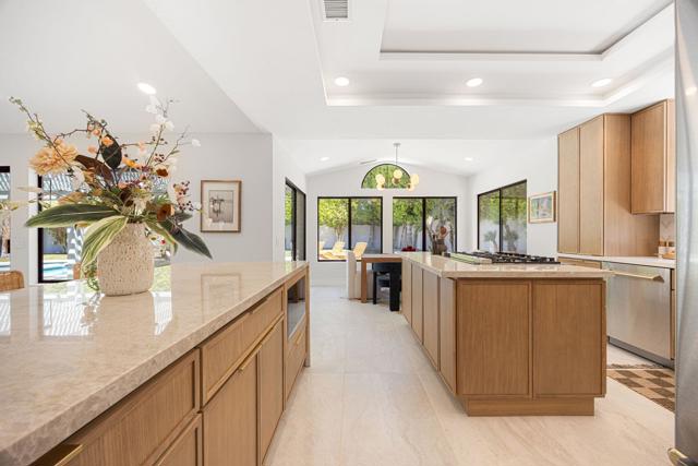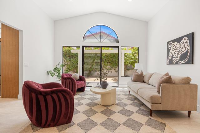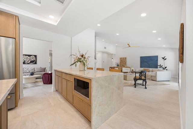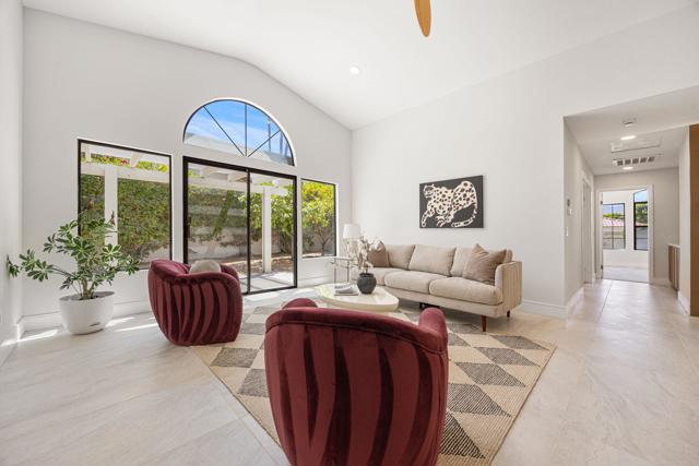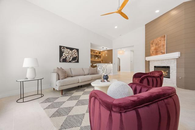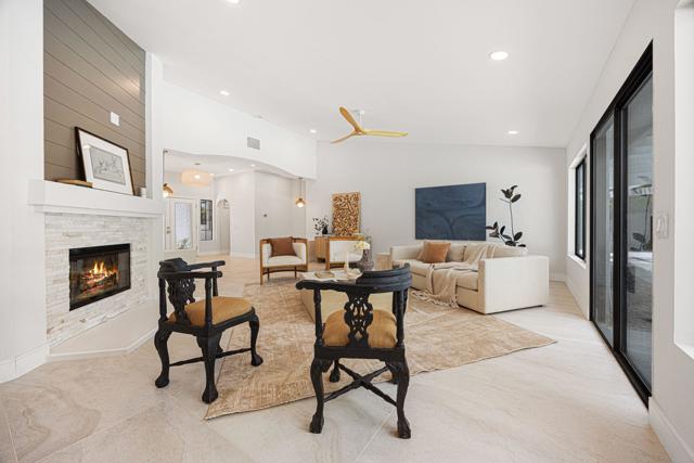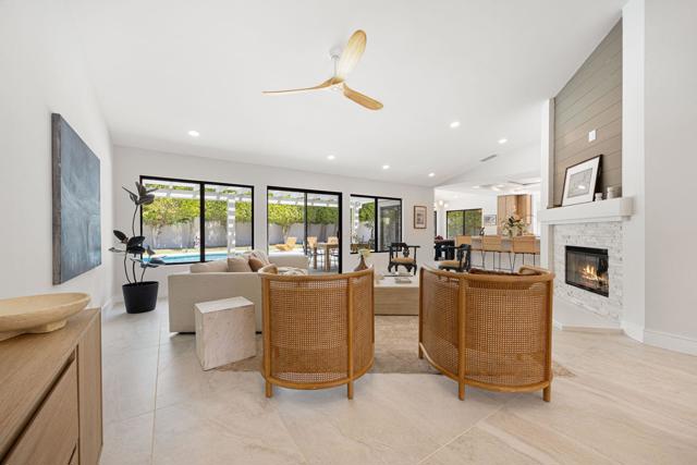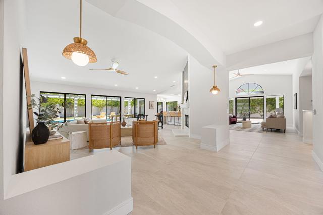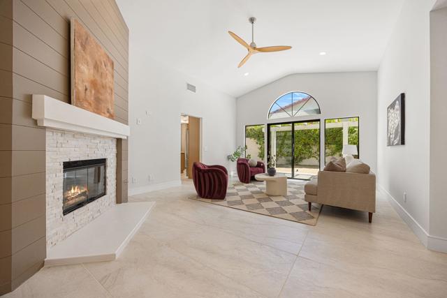 Beautifully reimagined desert residence located in the heart of Rancho Mirage. Welcome to 75 San Marino Circle, a fully renovated showpiece that seamlessly blends warm modern design with refined desert living. This thoughtfully curated home features soaring vaulted ceilings and two spacious living areas, each anchored by its own fireplace, including a striking dual fireplace that enhances both spaces while creating an inviting and functional layout ideal for relaxing and entertaining. At the center of the home is a brand-new designer kitchen, complete with slim oak shaker cabinetry, stunning Taj Mahal quartzite countertops and finishes, and a premium 36-inch dual fuel ZLINE range with matching appliances, perfect for the modern chef. The luxurious primary suite offers a spa inspired retreat with custom tiled shower walls, dual walk-in closets, and thoughtfully designed built-ins providing both style and functionality. Additional highlights include custom lighting throughout, enhancing the home's warm and elevated ambiance, along with a three-car garage providing plenty of space and convenience. Step outside to enjoy the upgraded pool and refreshed landscaping, designed for effortless indoor-outdoor living and year-round enjoyment. Every detail of this home has been carefully selected to deliver a sophisticated yet comfortable desert lifestyle, ideally located just minutes from shopping, dining, casinos, and world class golf, offering the best of Rancho Mirage living.