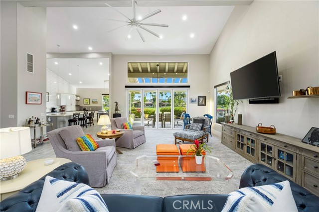 Rarely available south-facing Santa Fe floorplan in The Lakes Country Club with sweeping fairway, water, and Santa Rosa Mountain views. Thoughtfully reimagined in 2018 with an open-concept design, this approximately 2,764 sq. ft. residence offers 2 bedrooms, a den, and 3.5 baths, blending relaxed desert living with effortless entertaining. A coveted private gated side yard with tranquil water feature creates a serene retreat for games or cozy TV time outside. Inside, expansive accordion doors open the great room and chef’s kitchen to an extended patio designed for al fresco dining, sunset gatherings, and fireside evenings. Vaulted ceilings and abundant natural light enhance the spacious great room, dining area, and beautifully appointed kitchen with large island, premium appliances, walk-in pantry, and casual seating. The primary suite is a private sanctuary with direct side yard access, a reconfigured bath, and custom closet built-ins. Guest accommodations include a den with office area and guest bedroom, both with ensuite baths, plus a powder room. The former golf cart garage has been converted into a versatile home gym with mini split. Ideally located with direct access to a community pool and spa, this exceptional home is offered turnkey furnished with golf cart—an incredible opportunity to enjoy The Lakes lifestyle from day one.