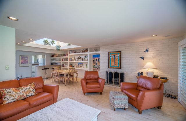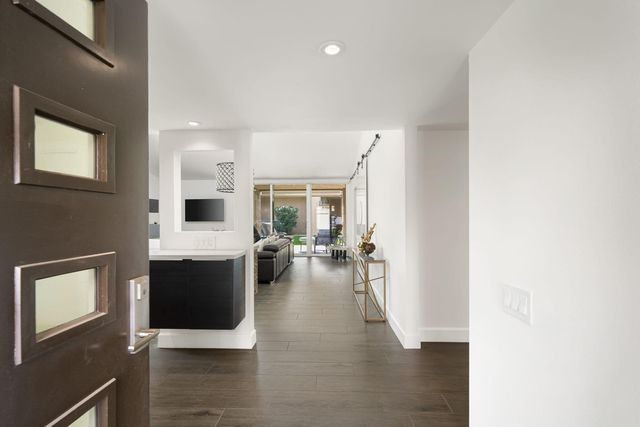Tesla Collection Plan 3 residence (2018) is distinguished by its contemporary design and premier location on the largest available lot, encompassing 17,424 square feet resort outdoor living . This home features 3 BEDROOMS + DEN/ OFFICE/ 4TH BEDROOM, 3 BATHROOMS and OWNED SOLAR: exceptional property that provides expansive environment for outdoor enjoyment.The home offers a resort-style backyard meticulously designed for outdoor living and entertaining. The exterior amenities include a swimming pool, a spa enhanced with a cascading water feature, an outdoor BBQ area, a bricked gas fireplace, a unique over-water golf hole, a two-tier putting green, a bocce ball court, and a dedicated outdoor workout space . A covered balcony equipped with a grill, counters, and seating further enhances the outdoor experience.The interior of the residence showcases numerous upgrades, such as elegant glass cabinetry and doors, sophisticated recessed ceilings and lighting, soffits, exterior sliders, under-lit floating cabinets, a fireplace, integrated ceiling speakers, ceramic tile flooring, and plantation shutters throughout. The entryway features stunning high ceilings, complemented by 10-foot ceilings throughout the remainder of the home. The open living area is designed with sliding glass doors that create a seamless transition to the outdoor living space. The property also includes a finished, air-conditioned garage with an epoxy floor and built-in shelving. Furthermore, the home has 37 OWNED invisible SOLAR PANELS and features a modern flat roof design.Conveniently situated within the secured Genesis gated community, off Gerald Ford between Cook and Portola, residents benefit from swing arm and RFID tag-activated gates, two dog parks, an open play area, a community gym, pool, hot tub, and an outdoor grill and dining area. The community is managed by an active board and HOA that diligently upholds community standards.The location offers excellent access to I-10, key arterial roads, and is just 11 miles from Palm Springs airport. Additionally, the planned adjacent 27-acre Millennium Park and numerous amenities within 1.5 miles, including gyms, hotels, restaurants, a private High School, a former-PGA tour public golf course, and a minor league hockey arena, add to the desirability of this location. With 250 sun-filled days per year and an average daily temperature of 73.1 degrees, This Palm Desert location offers an ideal lifestyle.